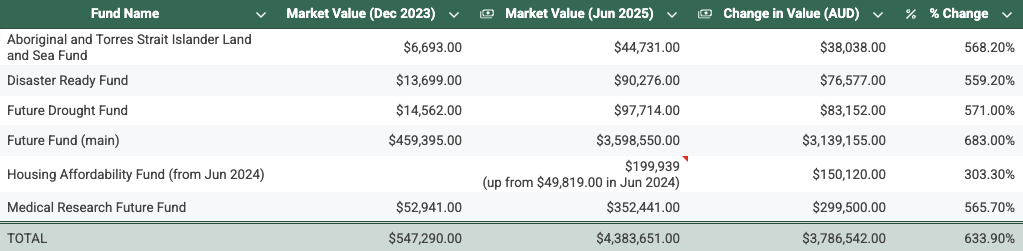 Source: Future Fund periodic statements 2023, 2025.