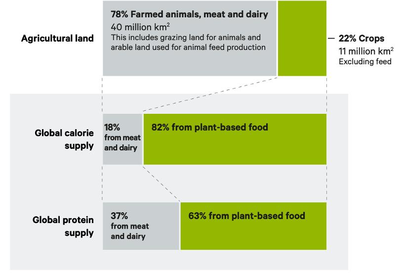 As seen in the graph below, 78% of farmland is currently used for animal agriculture (including growing their feed). Yet it only produces 18% of the global calorie supply and only 37% of the global protein supply. Conversely the other 22% of agricultural land produces 82% of the global calorie supply and 63% of the global protein supply with plants alone.