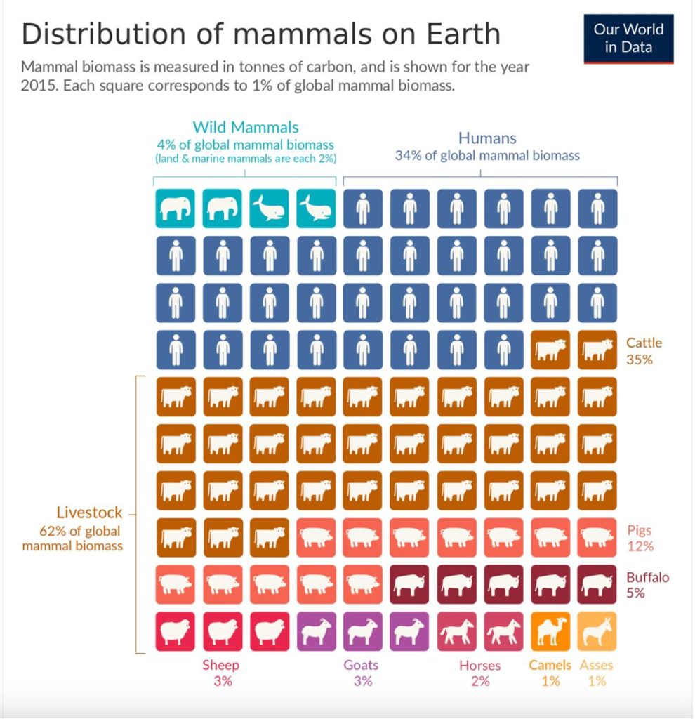 We’ve reduced wild mammals dramatically, a study found that wild mammals are just 4% of global mammal biomass, with humans making up 34%, and farmed animals a whopping 62%, of which cows alone make up 35% (Ritchie, 2022).